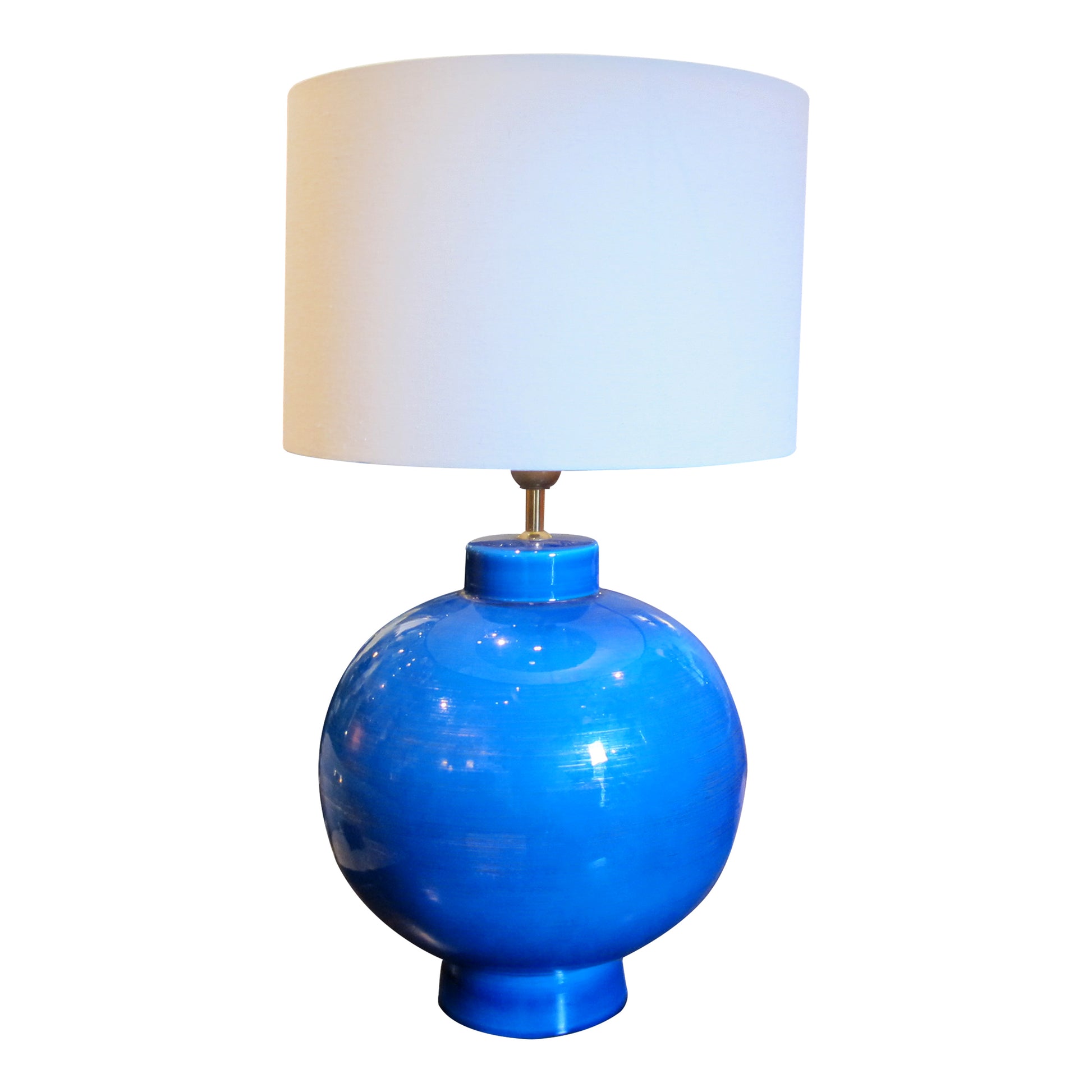Striking blue ceramic lamp from the 1970s, signed by L. Drummer. The lamp features a bold, spherical base with a rich, glossy glaze in a deep cobalt blue, highlighted by subtle tonal variations that add depth and character to the surface.