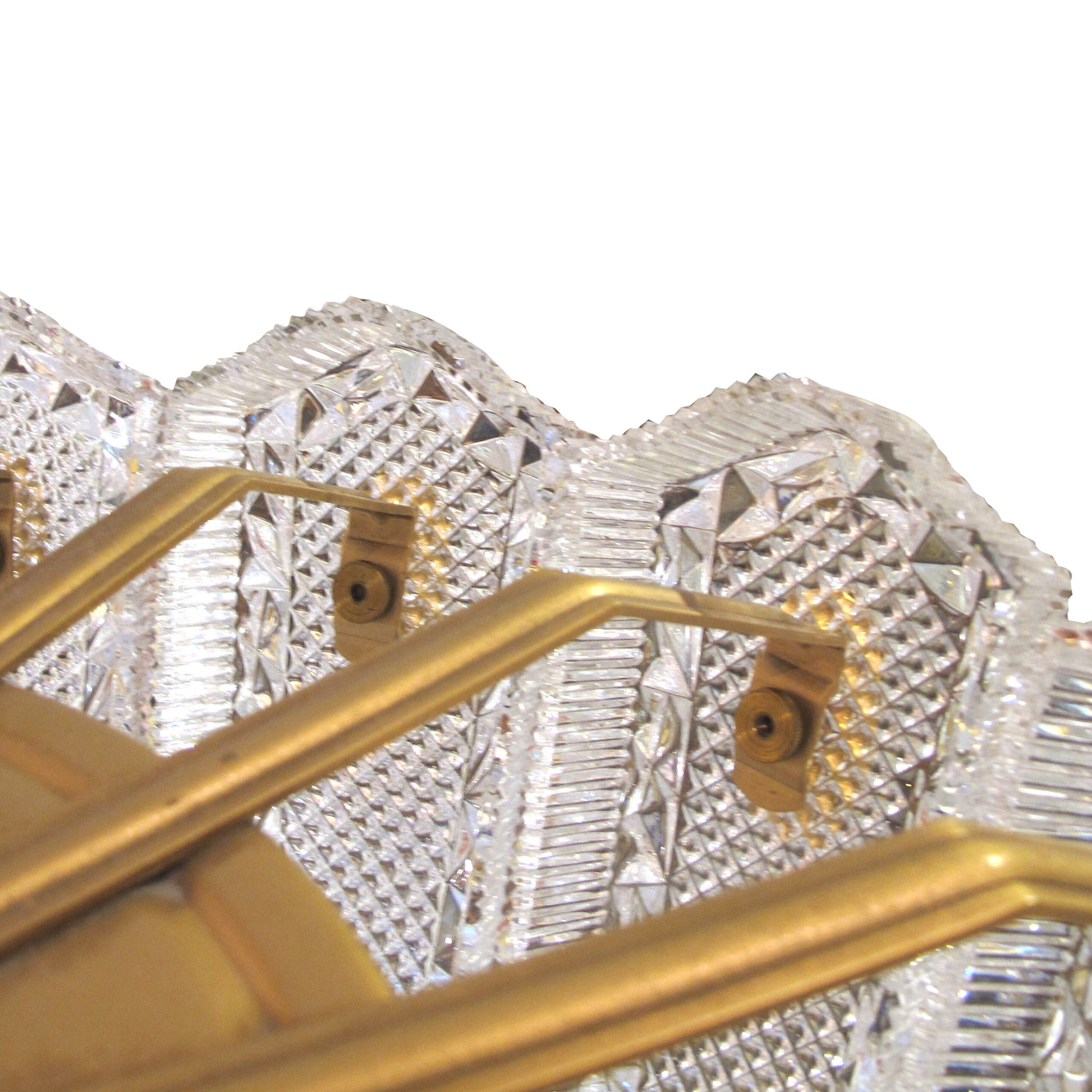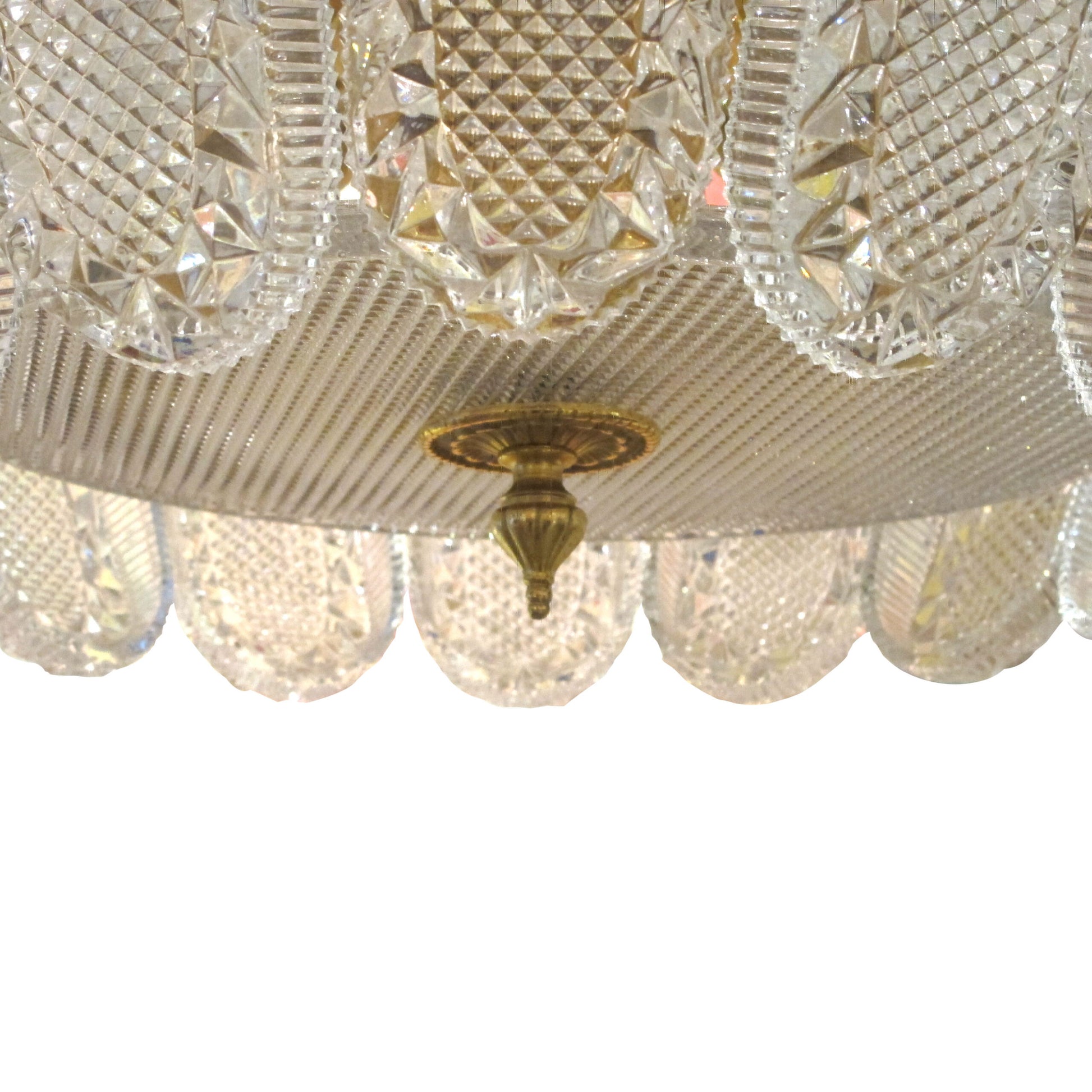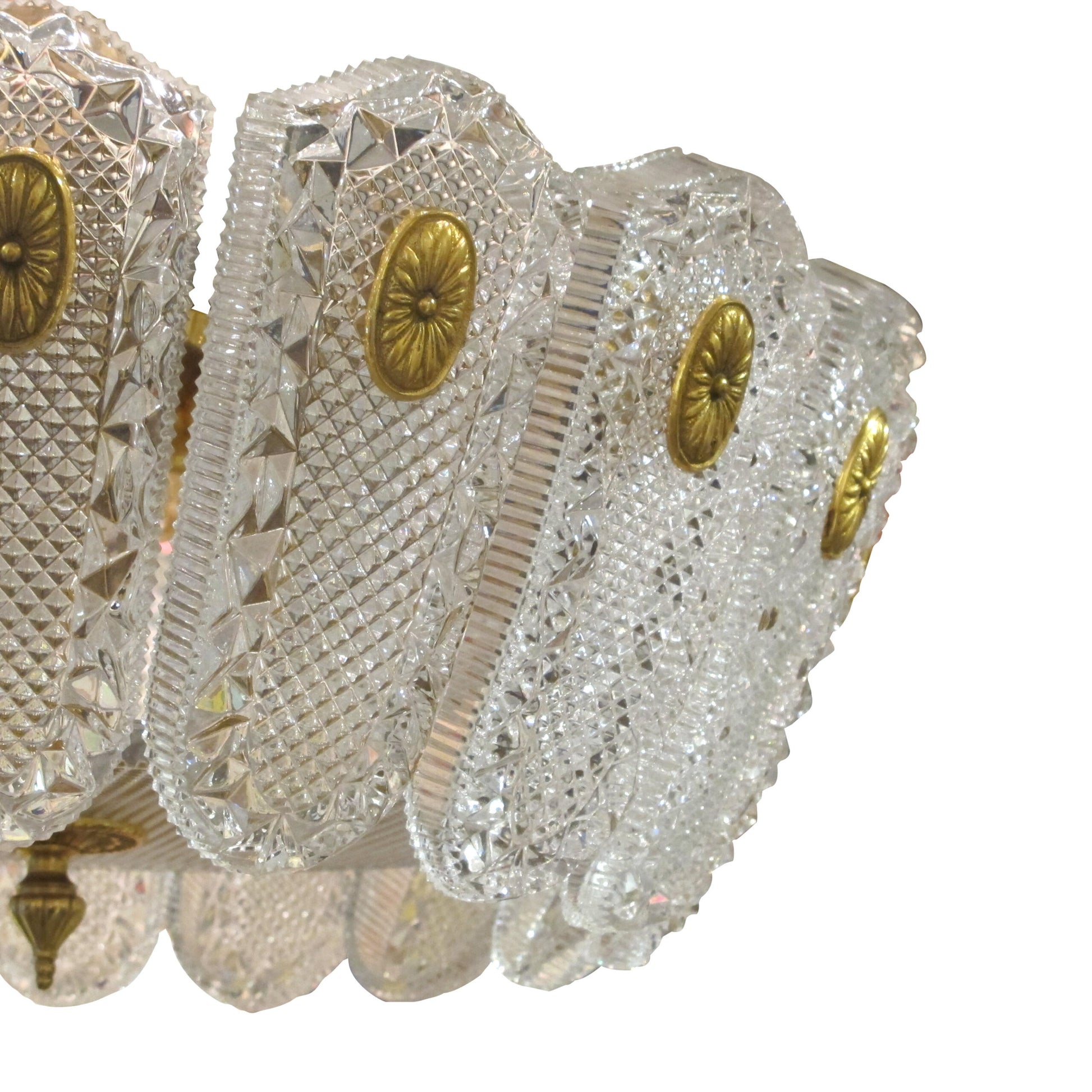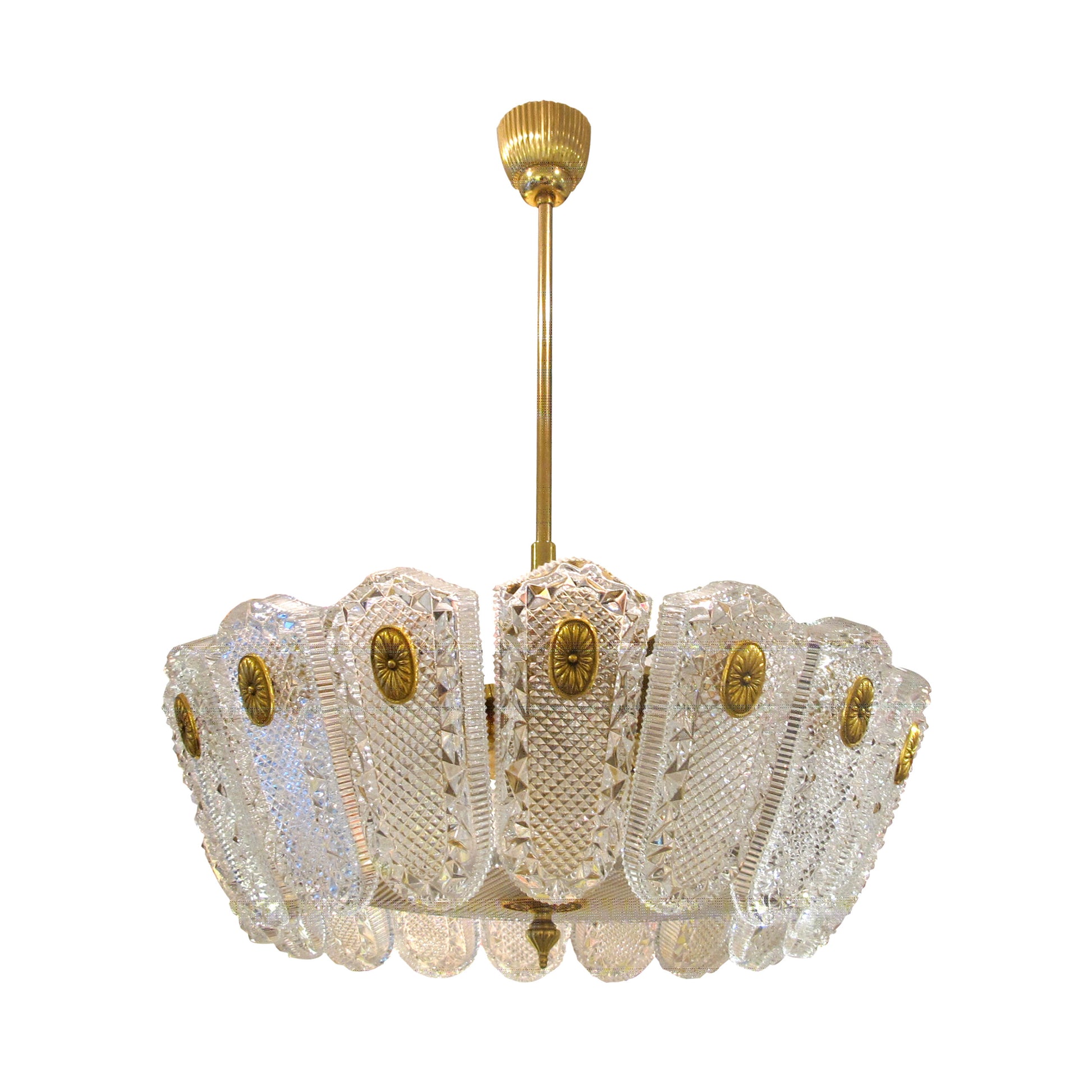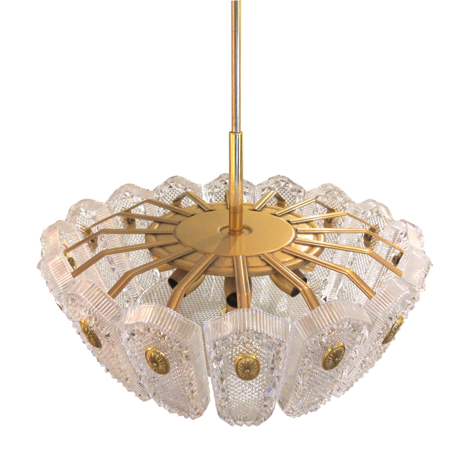 The ceiling light is a large light made with a series of 16 beautifully decorated glass panes held onto the frame by brass medallions. The chandelier is a great example of Orrefors’s work in the 1960s/70s. During this period, the company was known for its innovative use of glass and its collaboration with some of Scandinavia’s most talented designers. The chandelier is a beautiful and unique piece that would make a statement in any home.