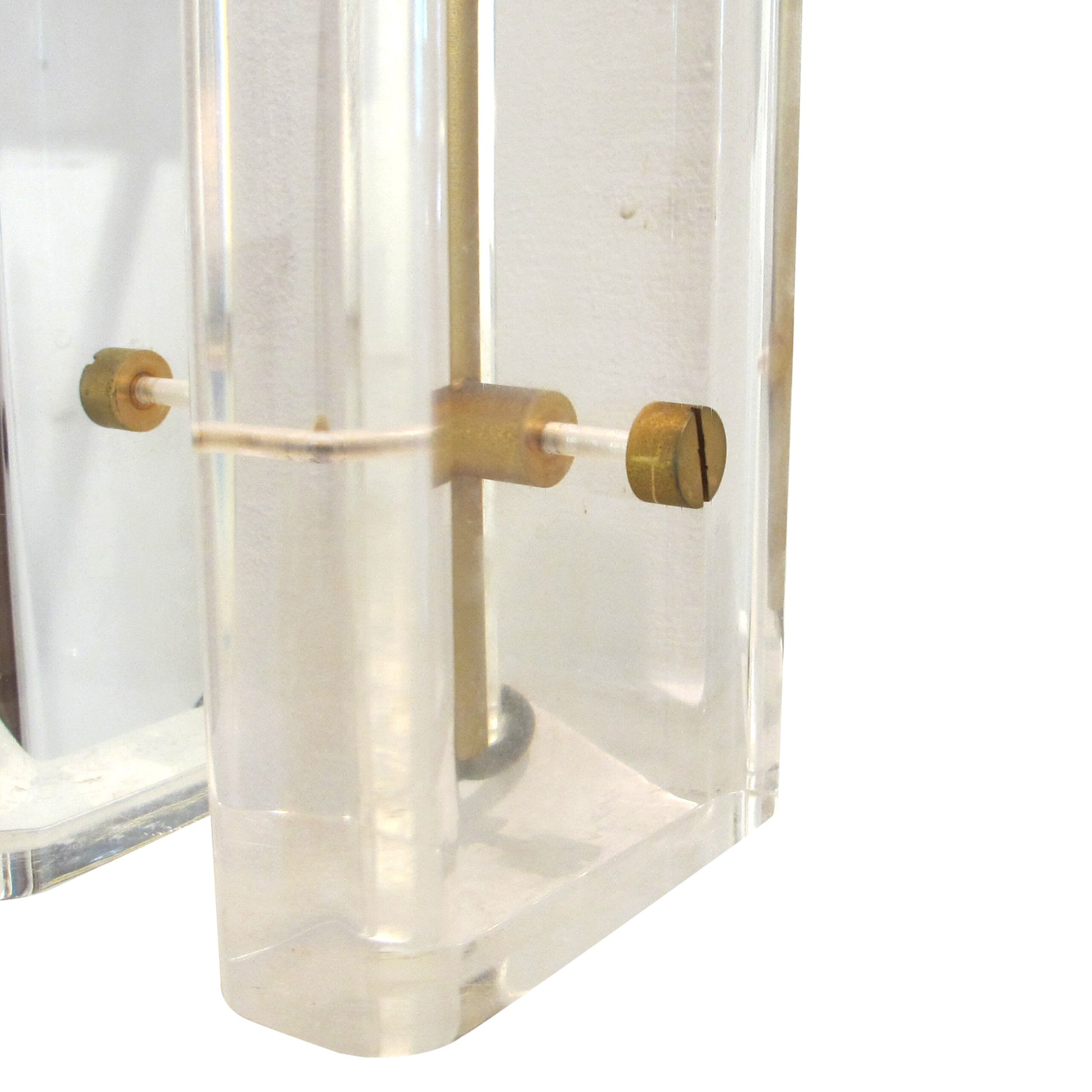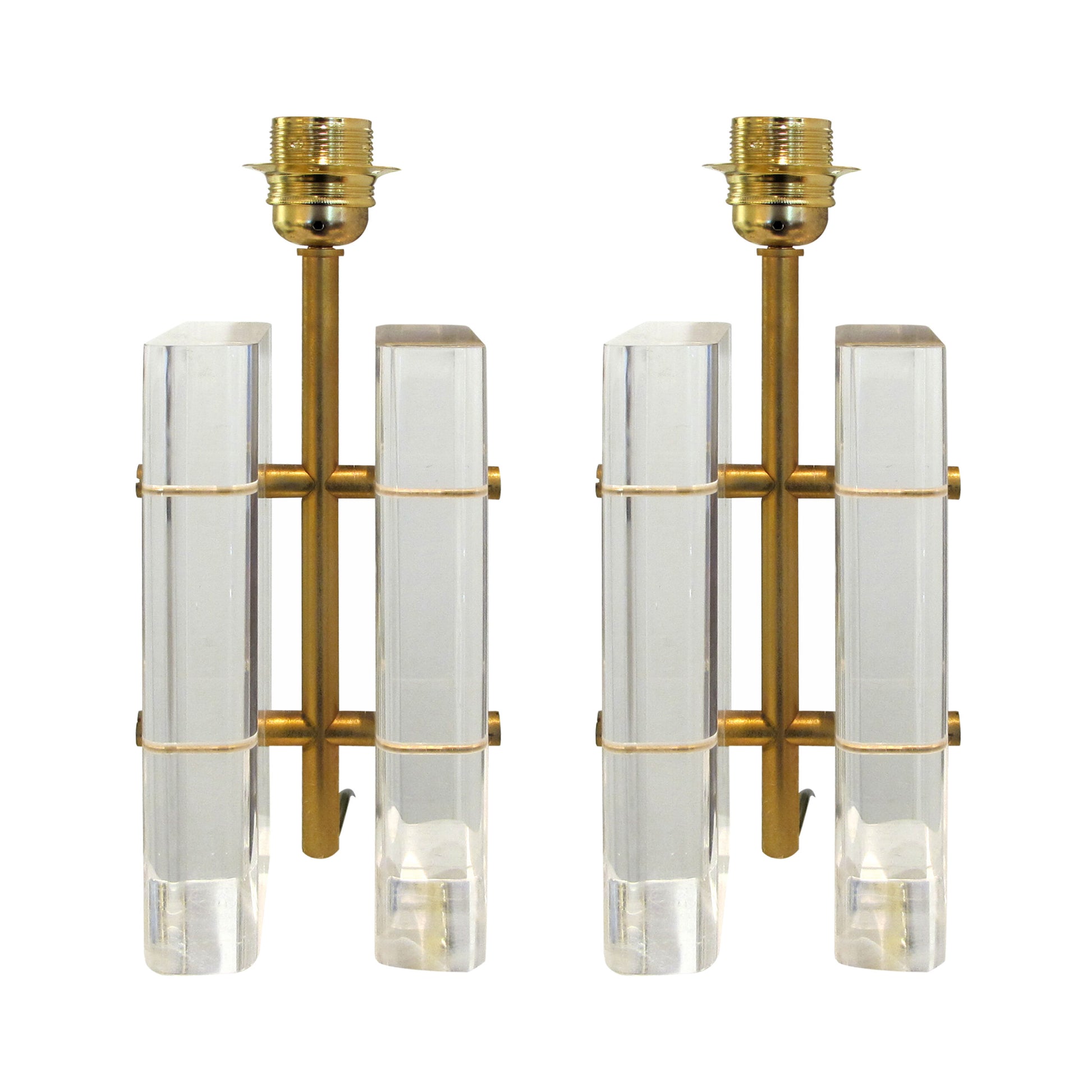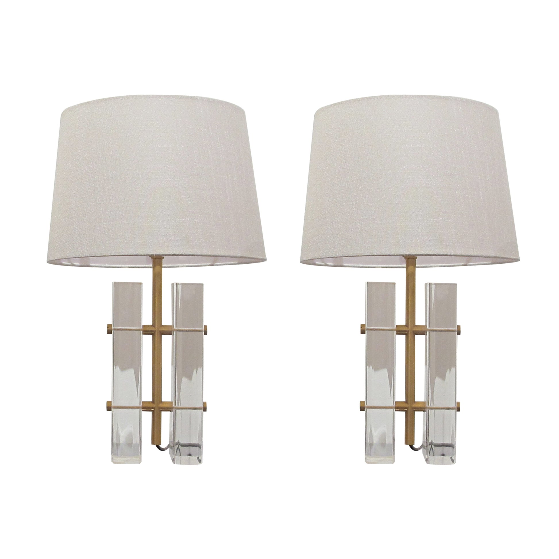 These 1970s table lamps combine clear Lucite blocks with sleek brass accents, creating a striking geometric design. The bases are composed of thick, transparent rectangular pieces of Lucite mounted vertically on a brass framework, giving the lamps an elegant yet industrial look. Each block is held in place by large brass screws.