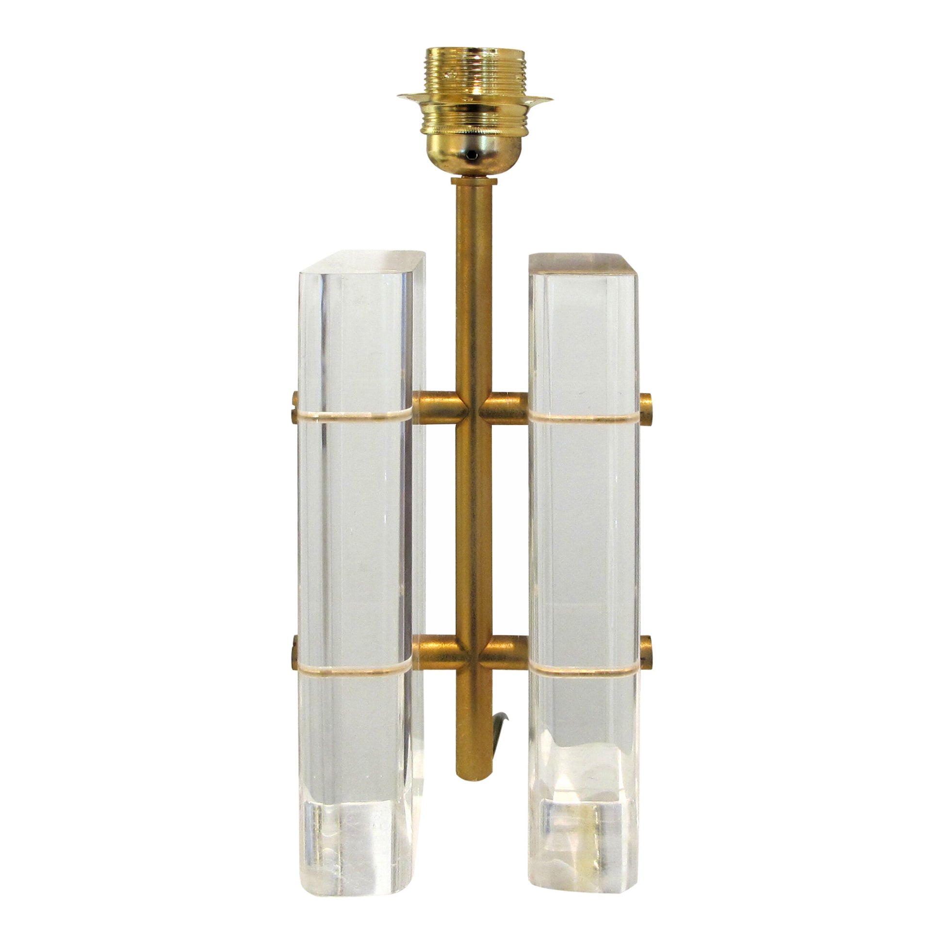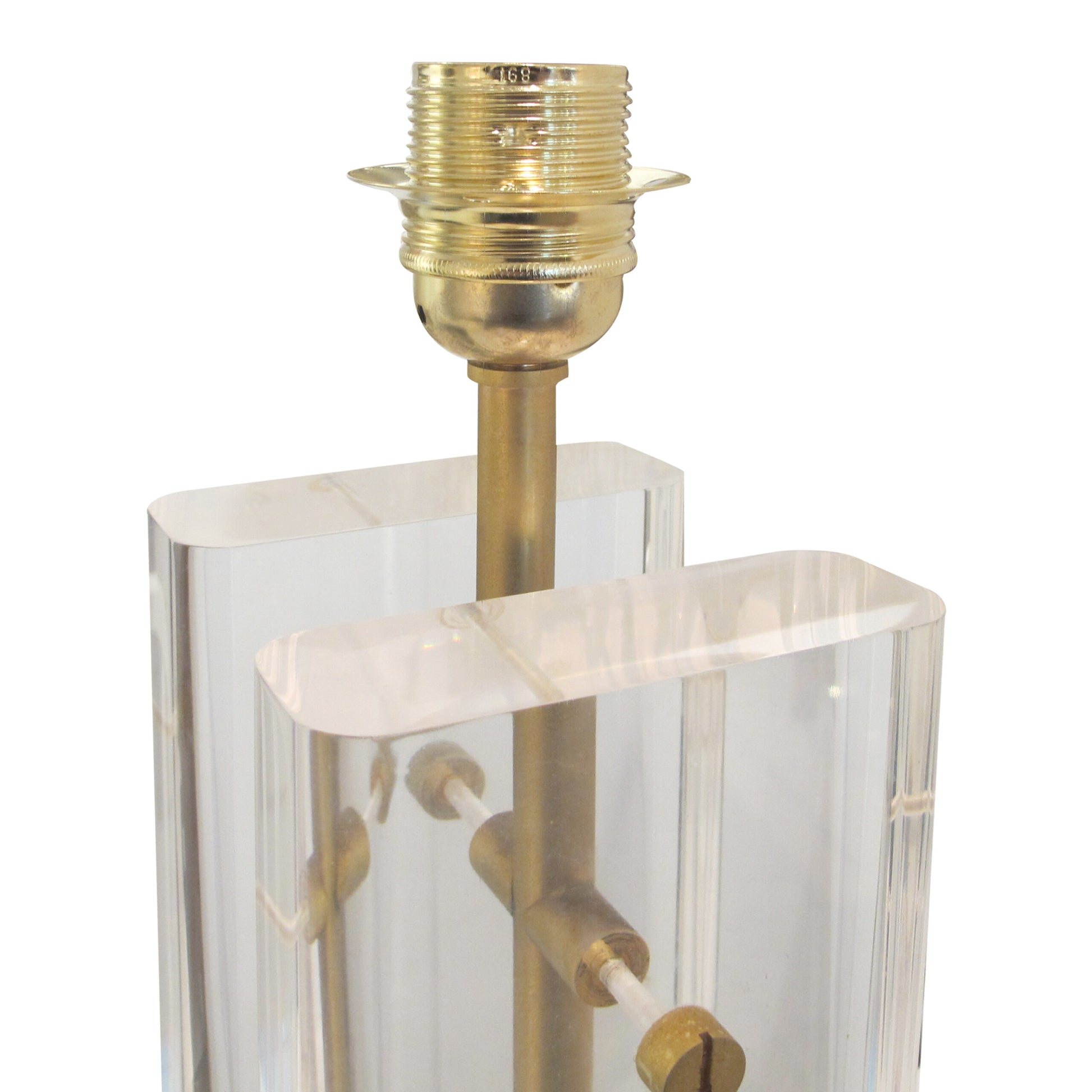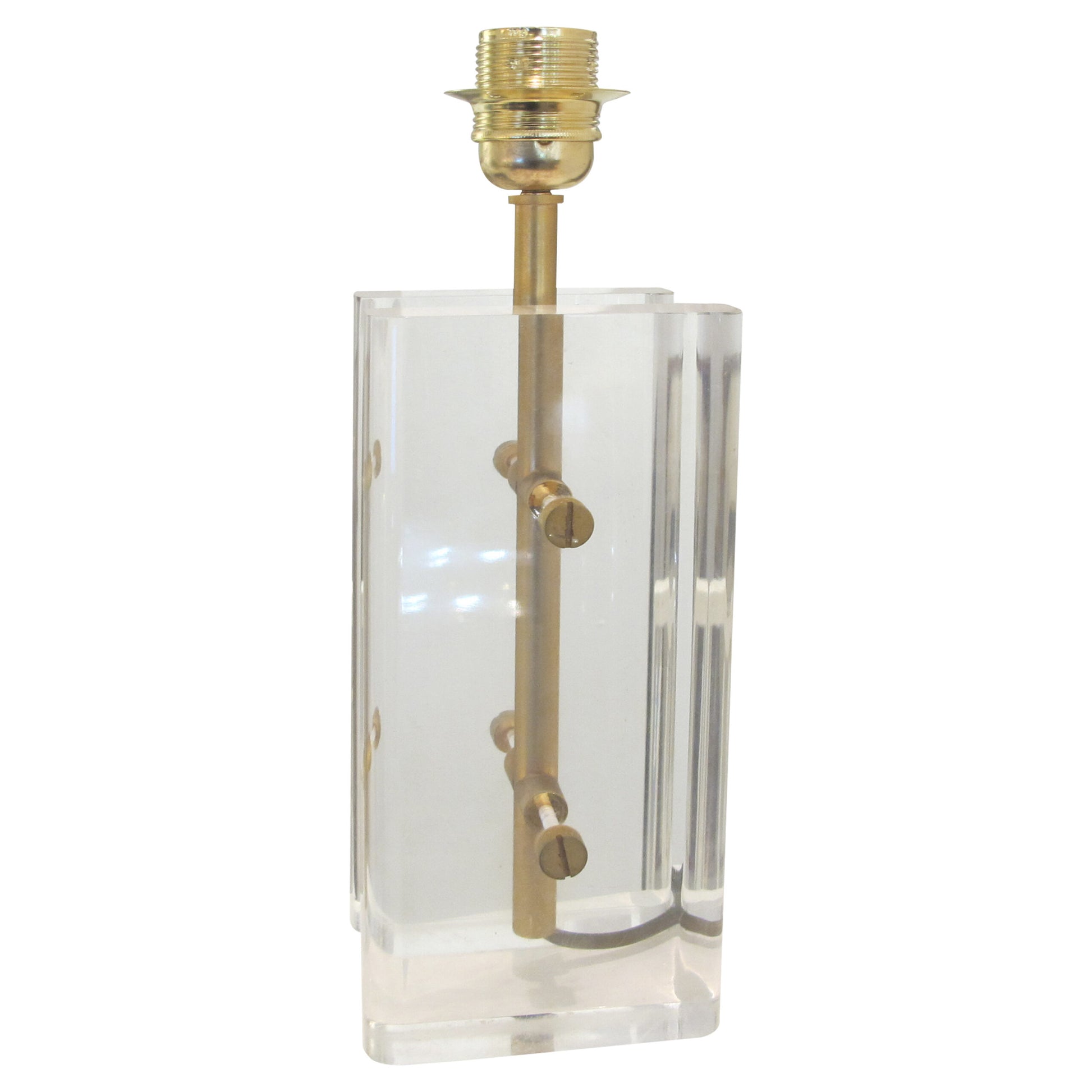 These 1970s table lamps combine clear Lucite blocks with sleek brass accents, creating a striking geometric design. The bases are composed of thick, transparent rectangular pieces of Lucite mounted vertically on a brass framework, giving the lamps an elegant yet industrial look. Each block is held in place by large brass screws.