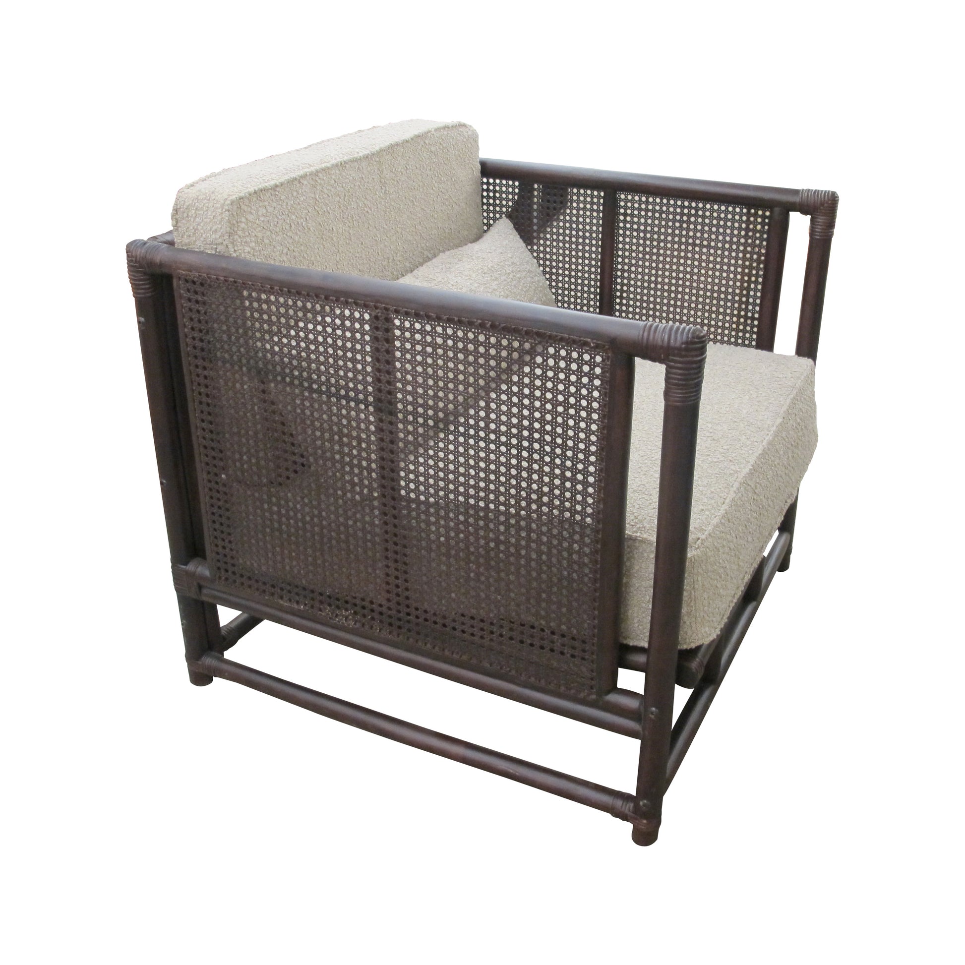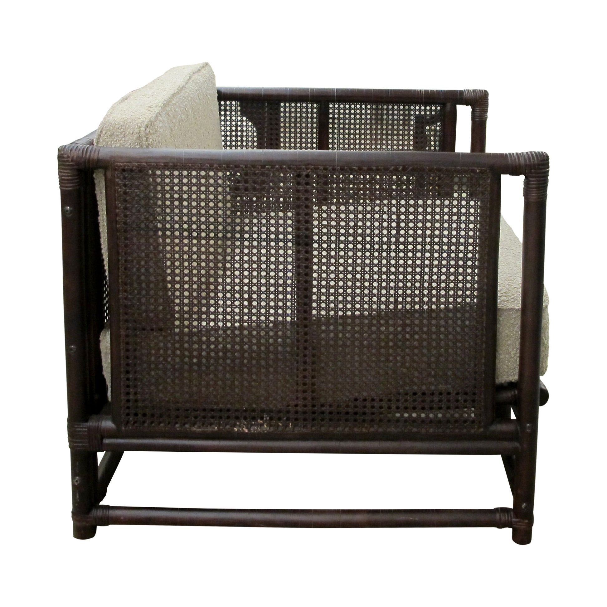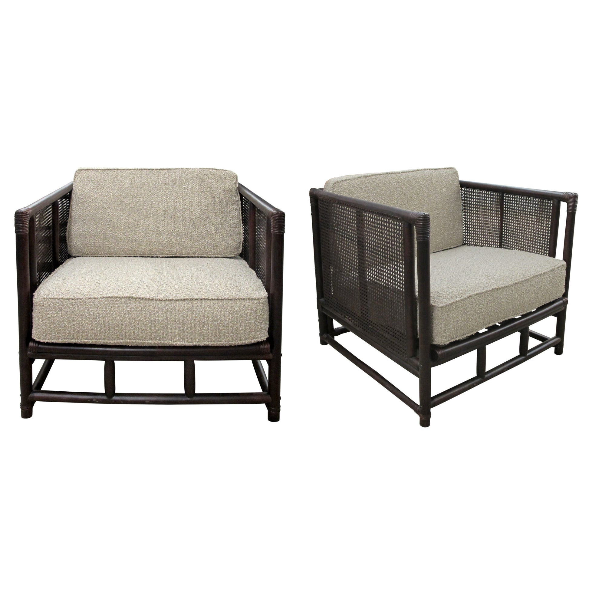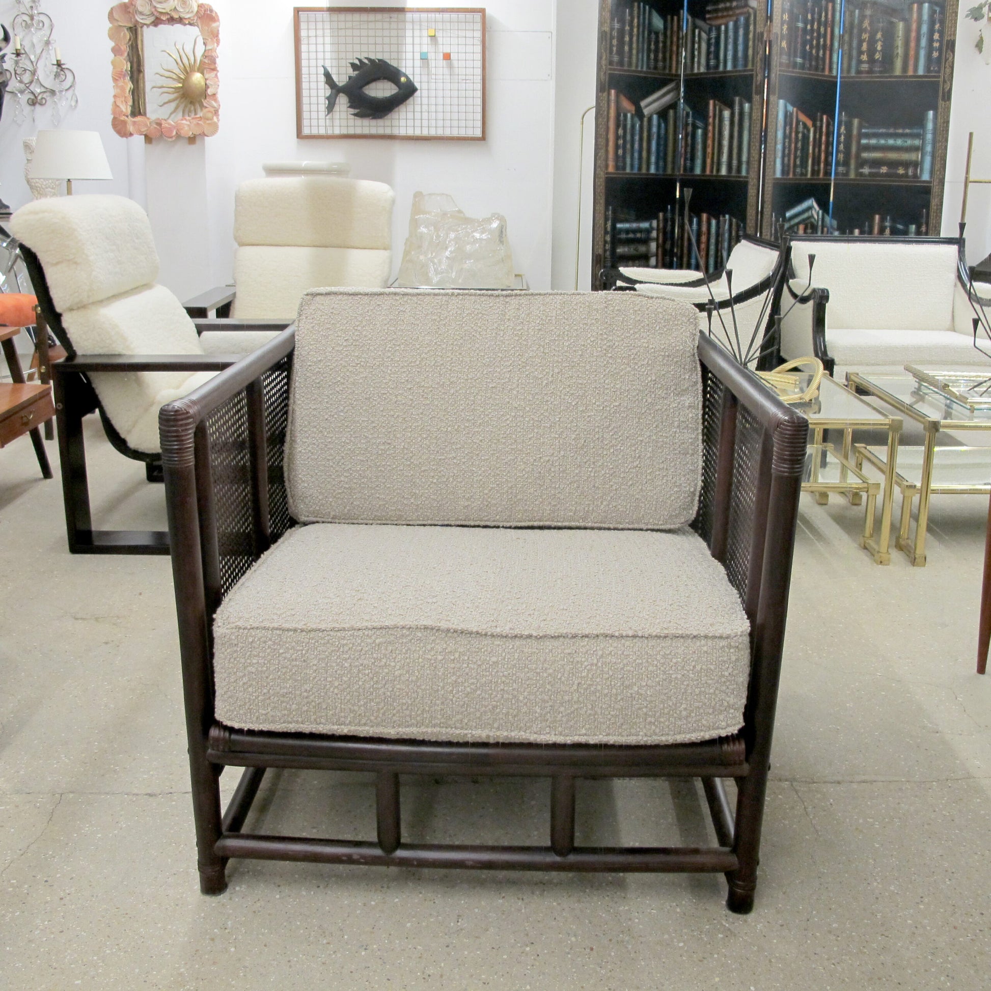Pair of French mid-century large structural armchairs made from bamboo and rattan, reflecting the timeless elegance of mid-20th-century aesthetics. The frames feature a dark brown finish, emphasising the natural texture of the materials. The armchairs have been newly upholstered in a soft boucle fabric in a neutral tone.
