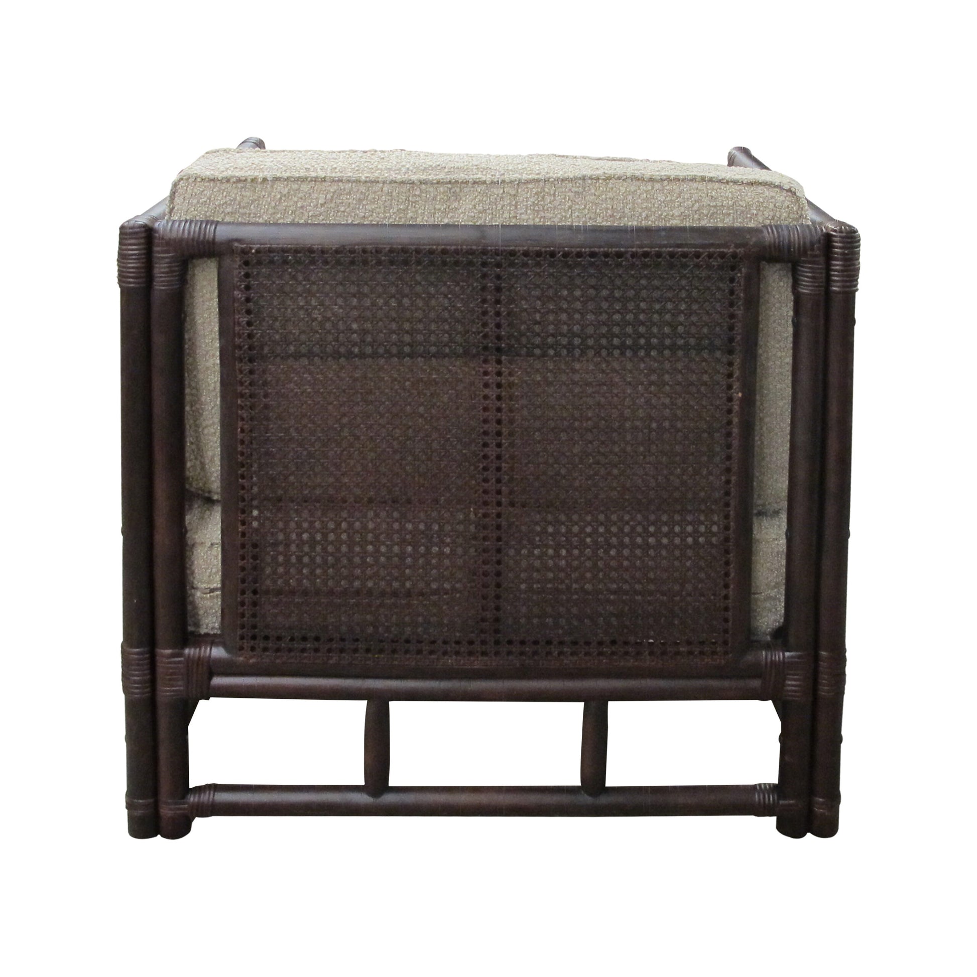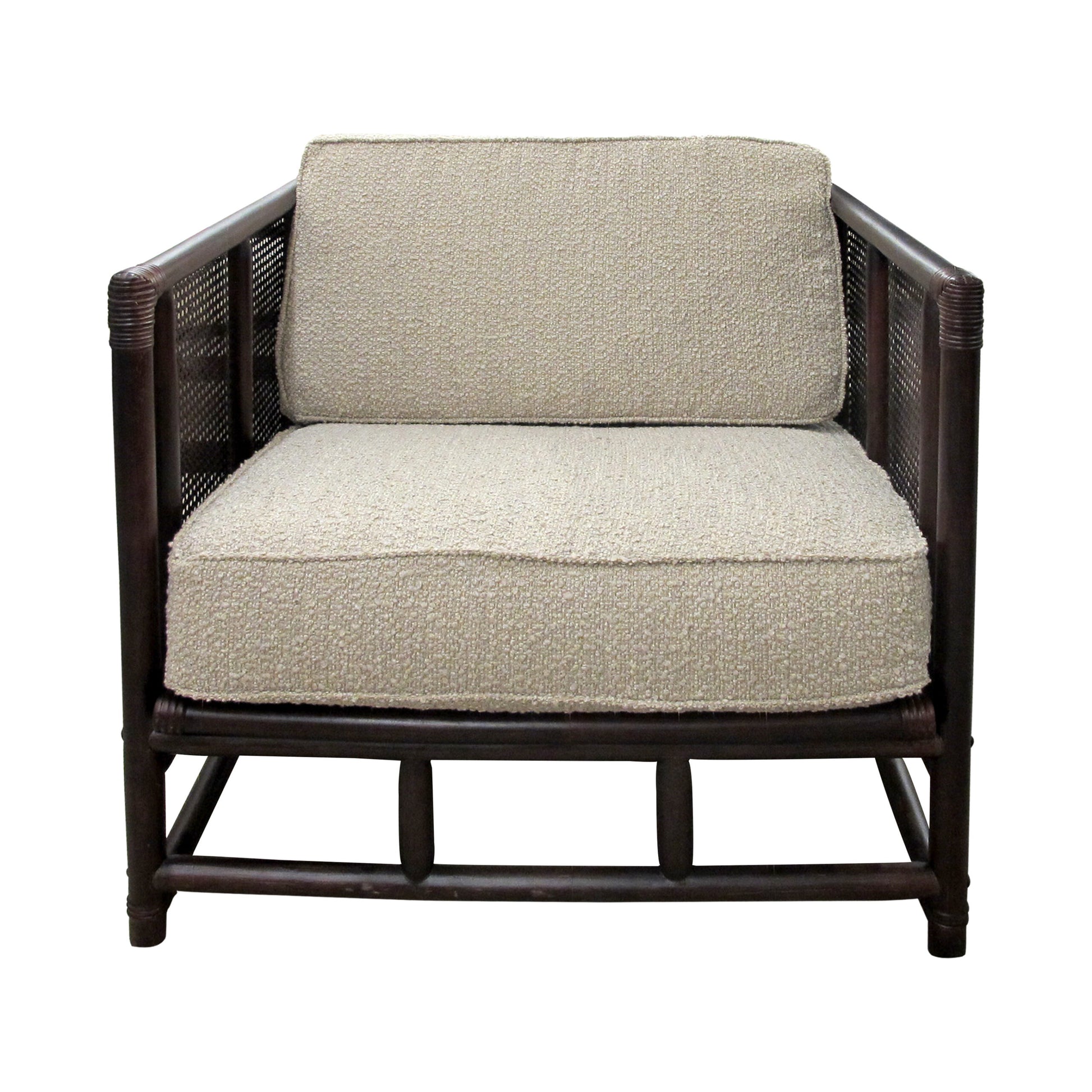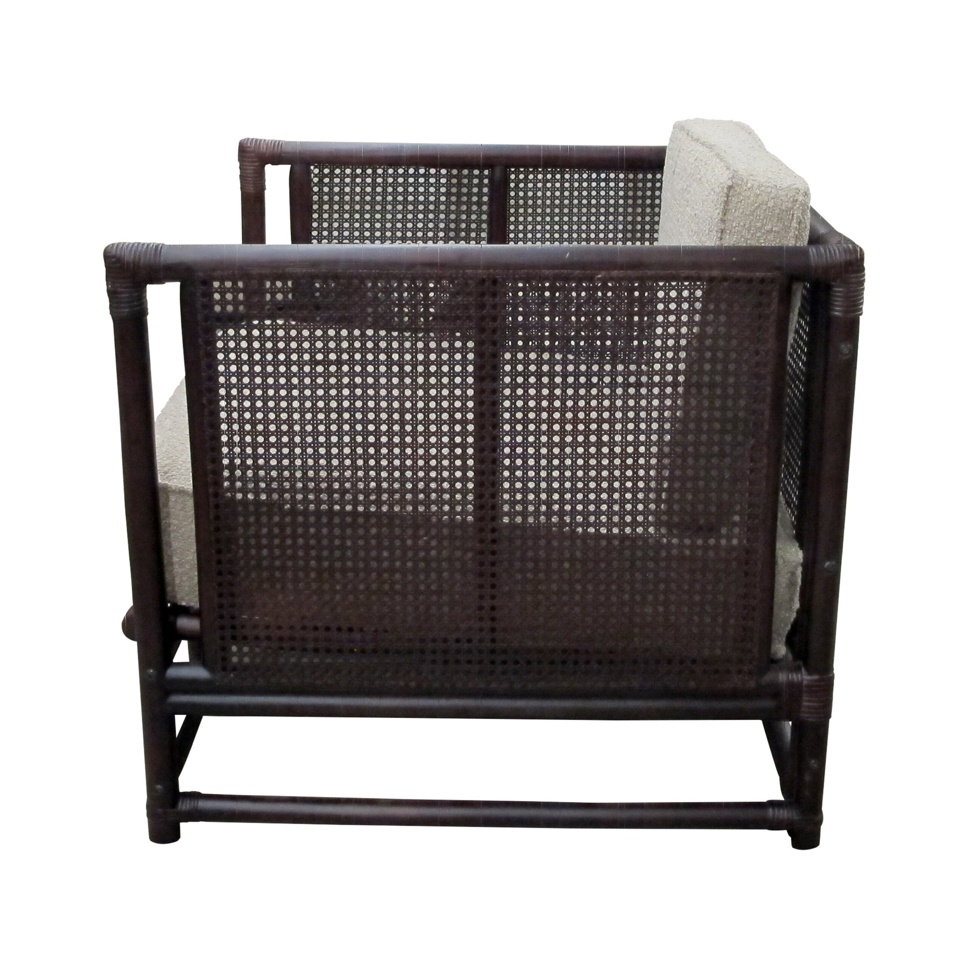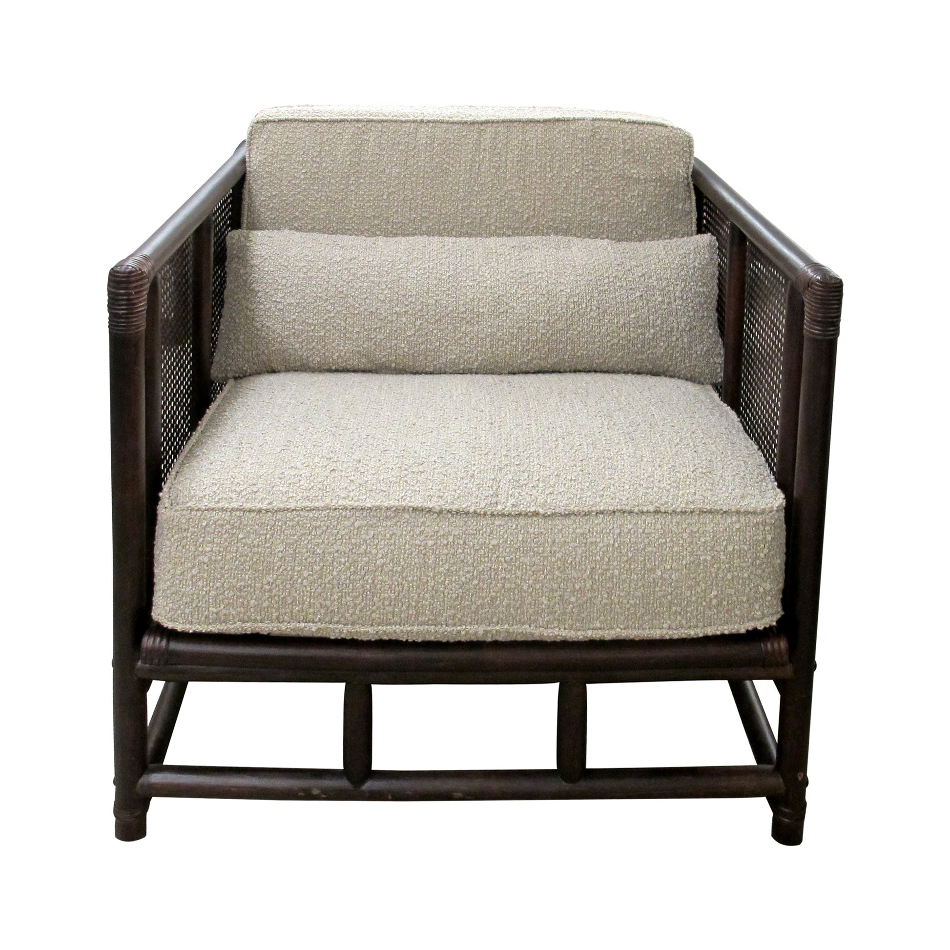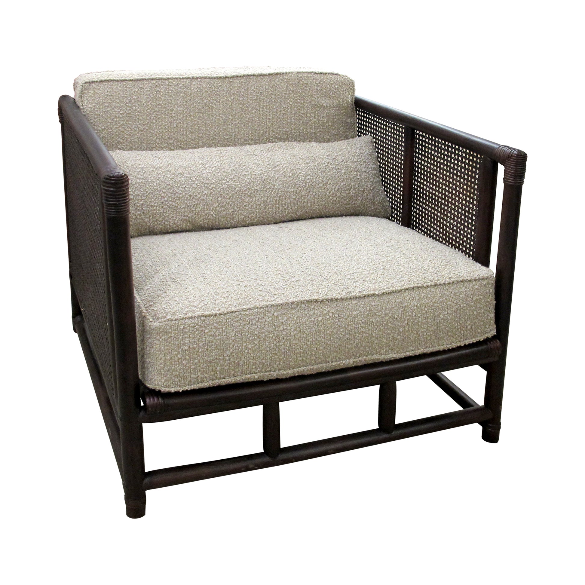 Pair of French mid-century large structural armchairs made from bamboo and rattan, reflecting the timeless elegance of mid-20th-century aesthetics. The frames feature a dark brown finish, emphasising the natural texture of the materials. The armchairs have been newly upholstered in a soft boucle fabric in a neutral tone.