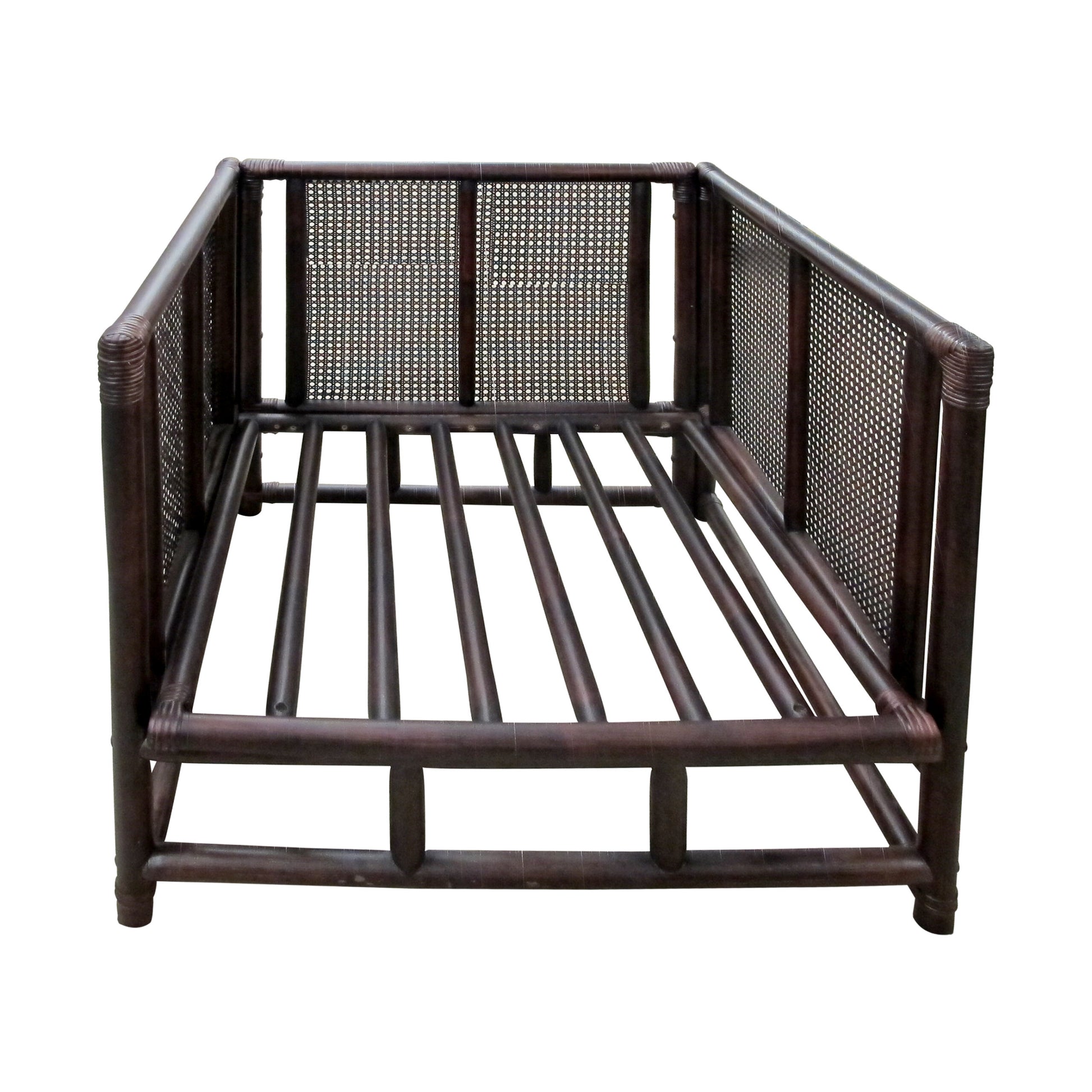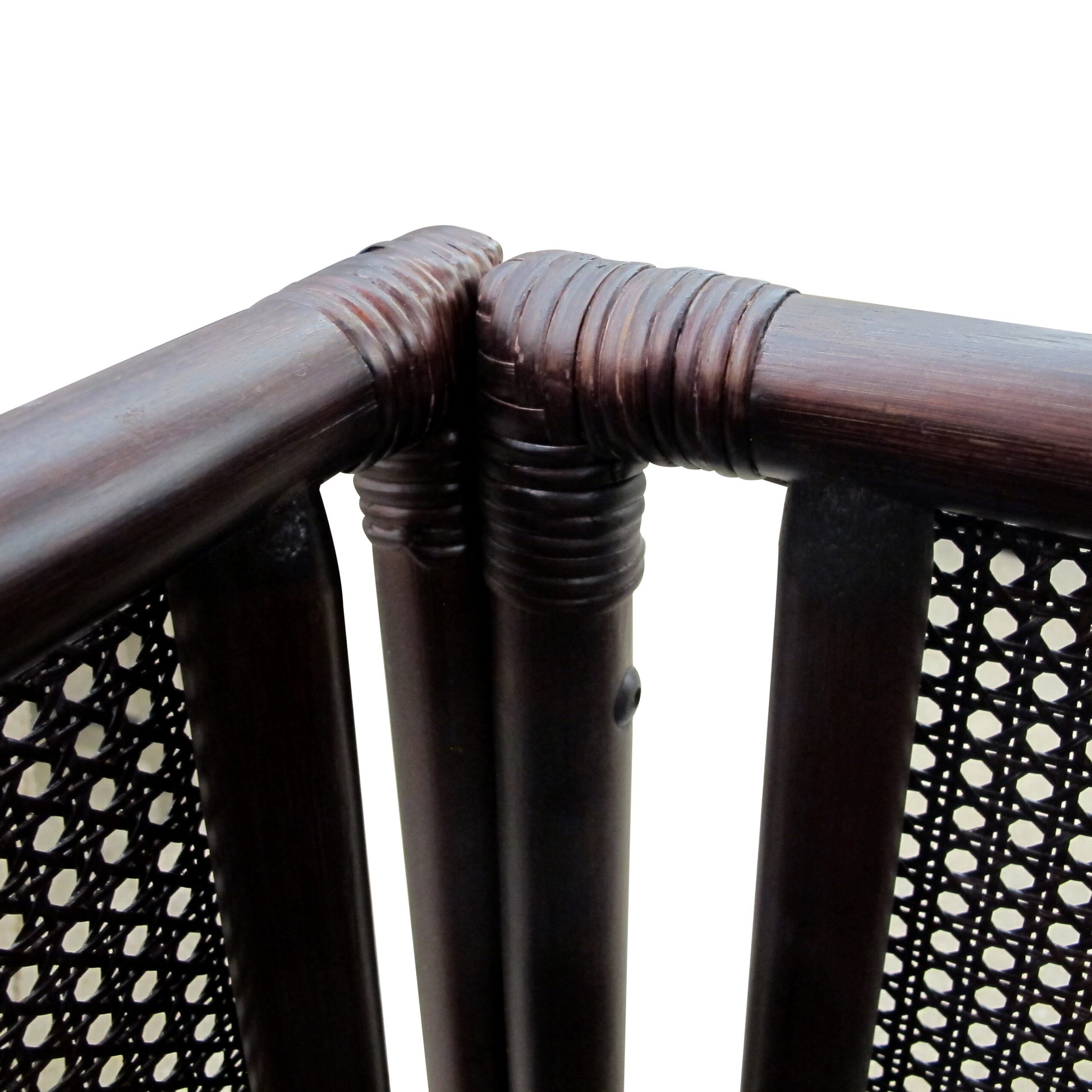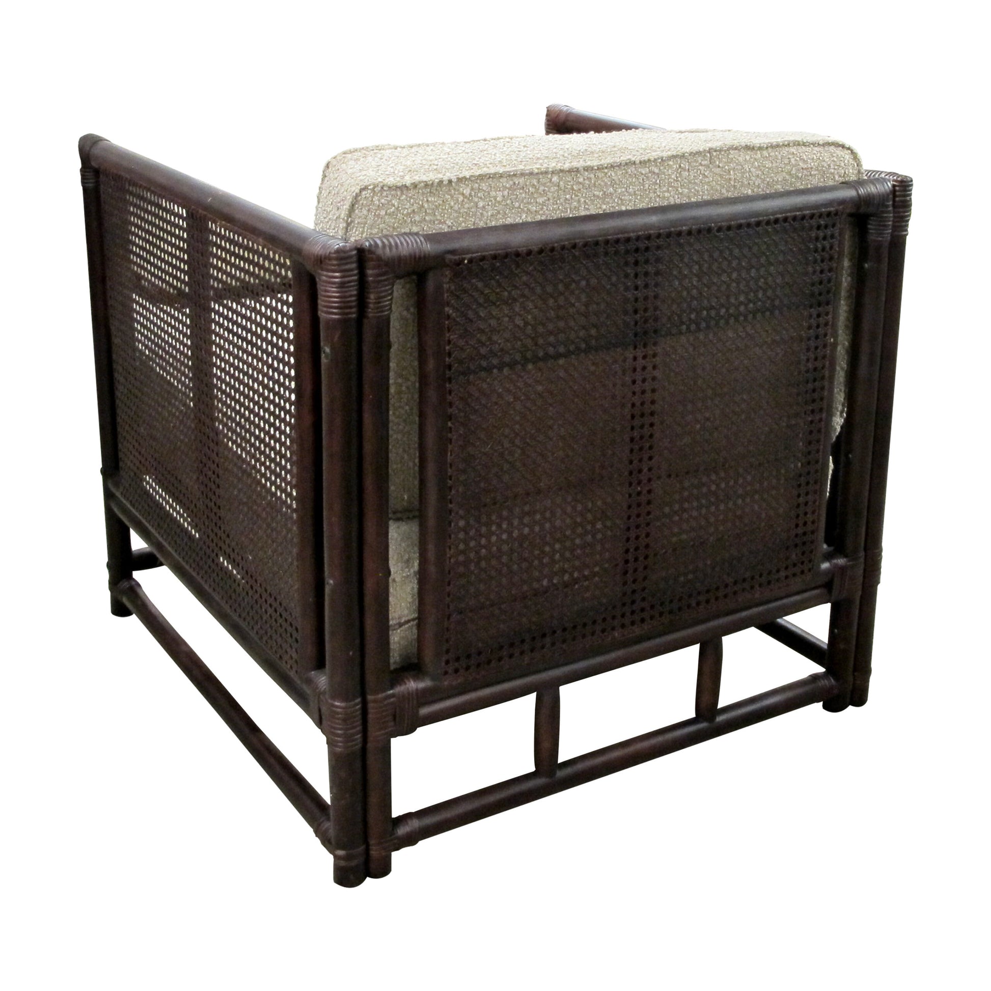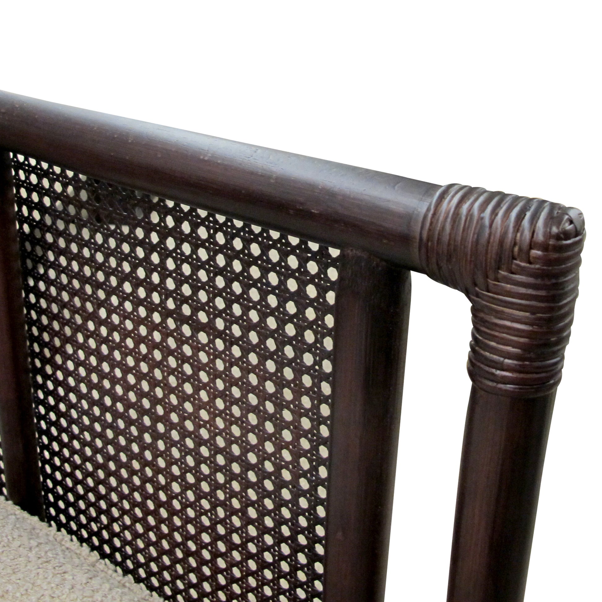 Pair of French mid-century large structural armchairs made from bamboo and rattan, reflecting the timeless elegance of mid-20th-century aesthetics. The frames feature a dark brown finish, emphasising the natural texture of the materials. The armchairs have been newly upholstered in a soft boucle fabric in a neutral tone.