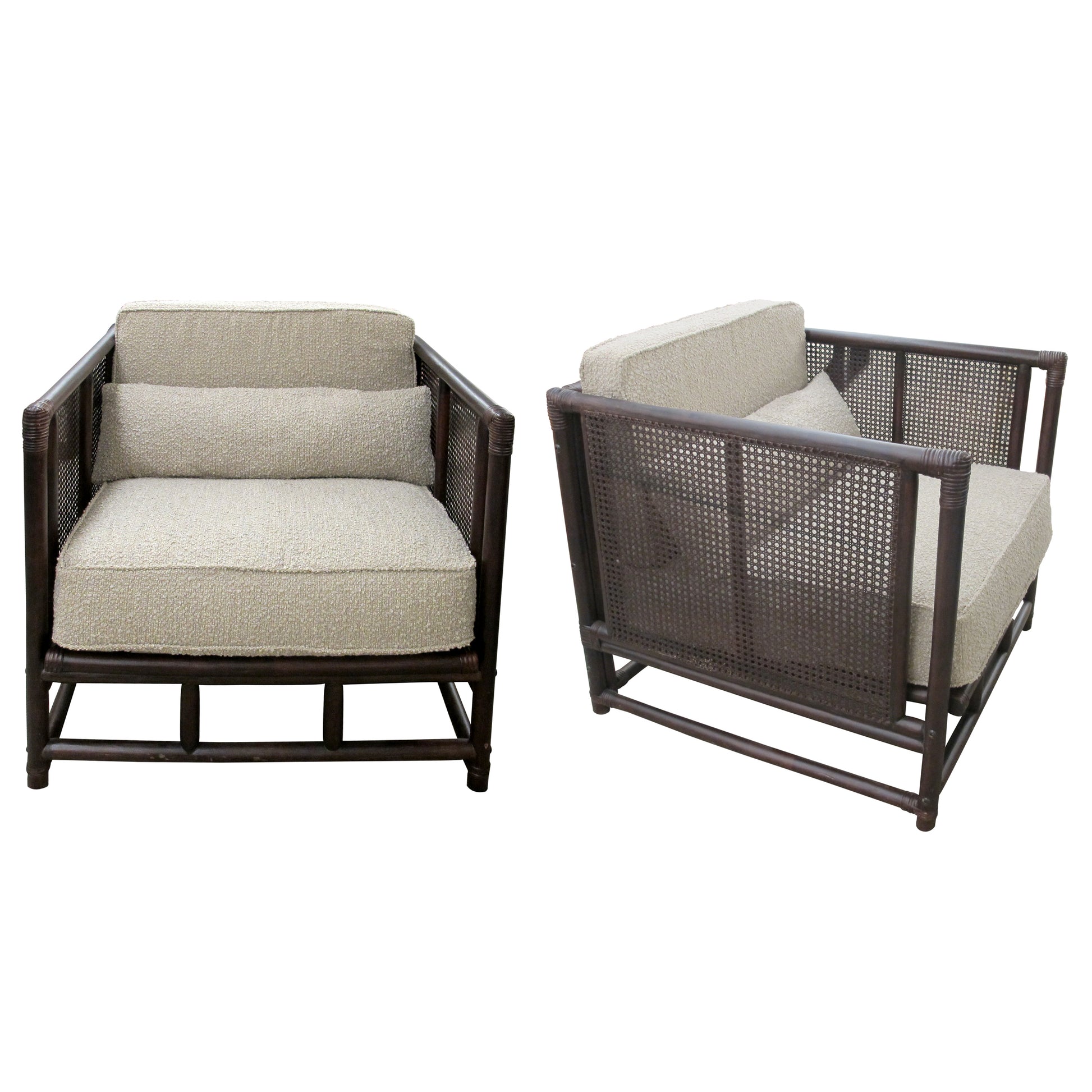 Pair of French Mid-Century Bamboo and Rattan Armchairs with Boucle Upholstery